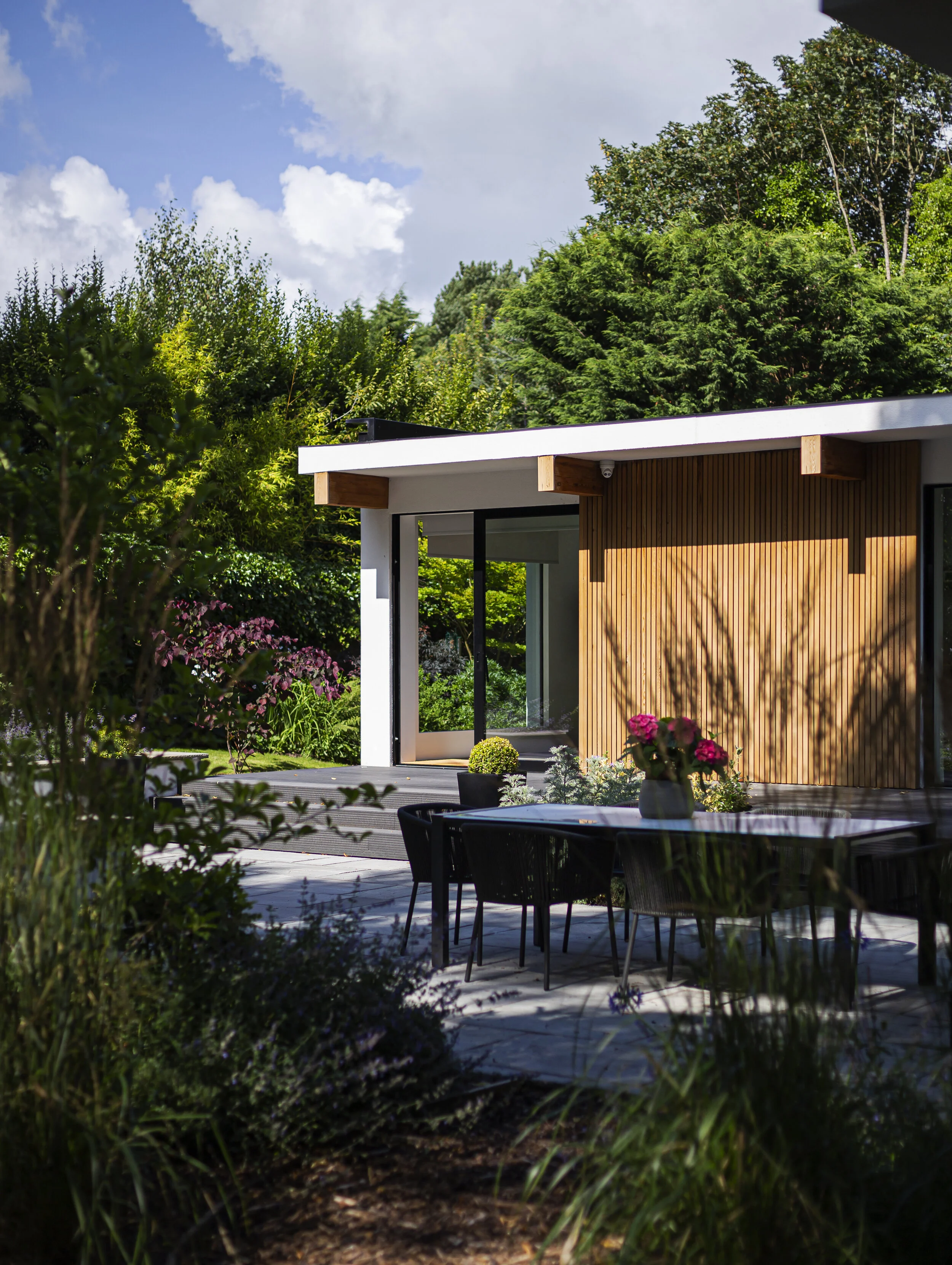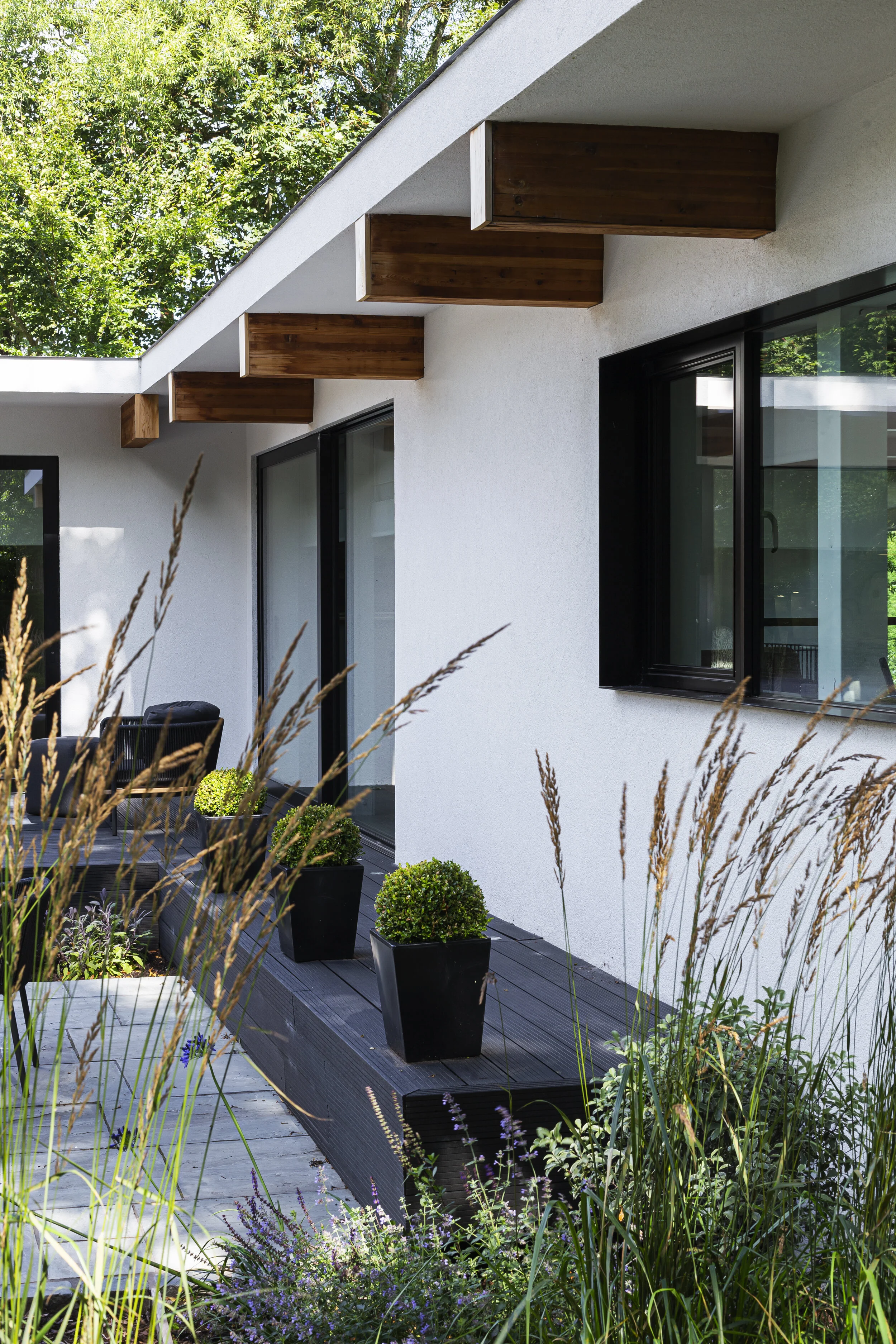 Elements of the original timber skeleton are visible in the exposed oak spars that project to form the external walkway.